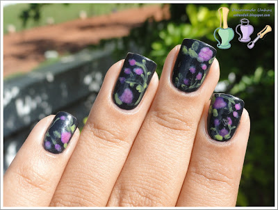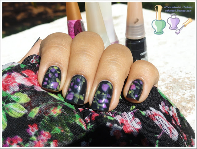 2 camadas do L'apogée Preto, as rosas eu fiz com o Impala Amor de Verão (sobre o preto ficou meio lilás, mas gostei mesmo assim), detalhes com o Beauty Color Lillies e raminhos com o Ludurana Leve.